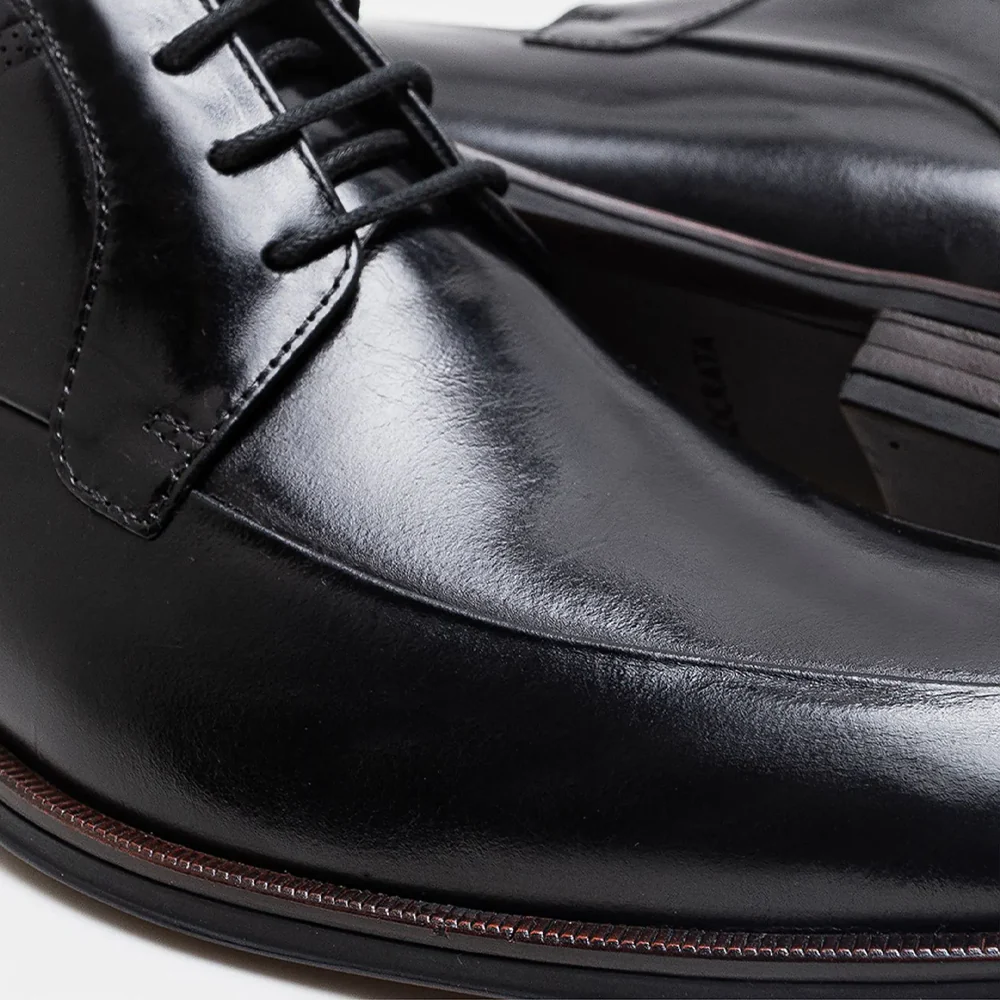 The Metropolitan Clooney Shoe is made of black leather. It has a lace-up closure , leather cutouts, leather lining, soft foam insole fixed to the shoe, and a rubber sole.